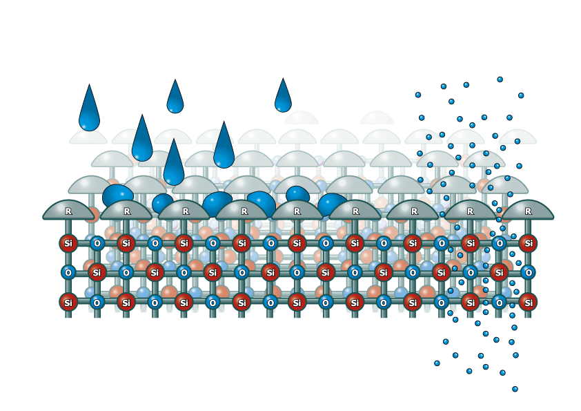 Some elastomeric compounds are also used to waterproof masonry. These mainly consist of polyurethane. Siloxanes (see graph), silicones and silanes also make an excellent choice for waterproofing. These are capable of 150% expansion when exposed to moisture. This is how they absorb all the water and protect the concrete structure.